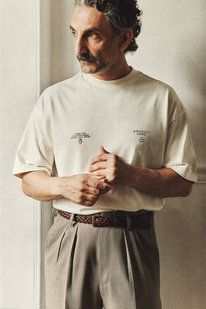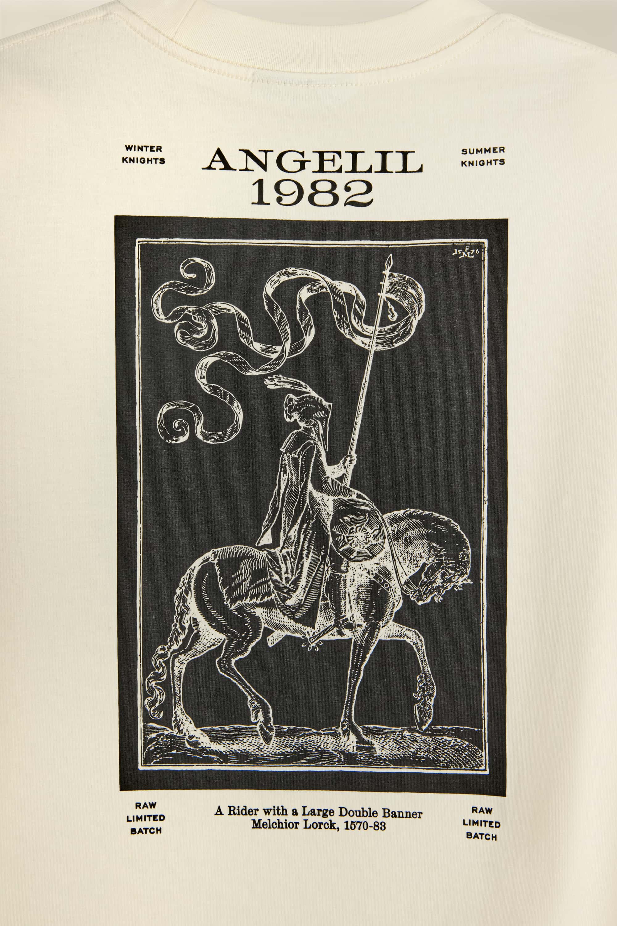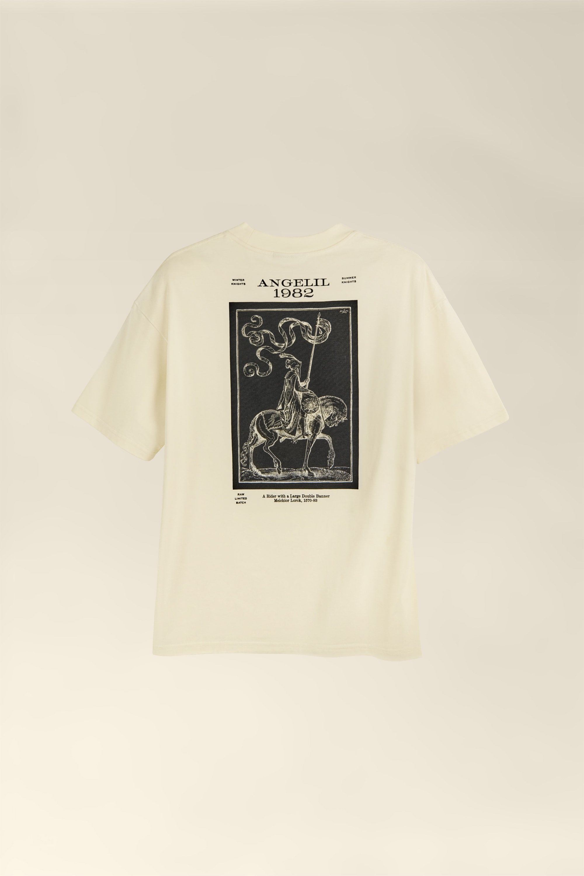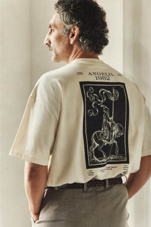 After testing different print techniques for this t-shirt, we chose water-based screen printing, a method that softens with time, fading slowly to create a worn-in look that feels like it’s always been yours. The large back print, drawn from a 16th-century engraving by Melchior Lorck, sits high on the shoulders, so it stays visible even when tucked in.